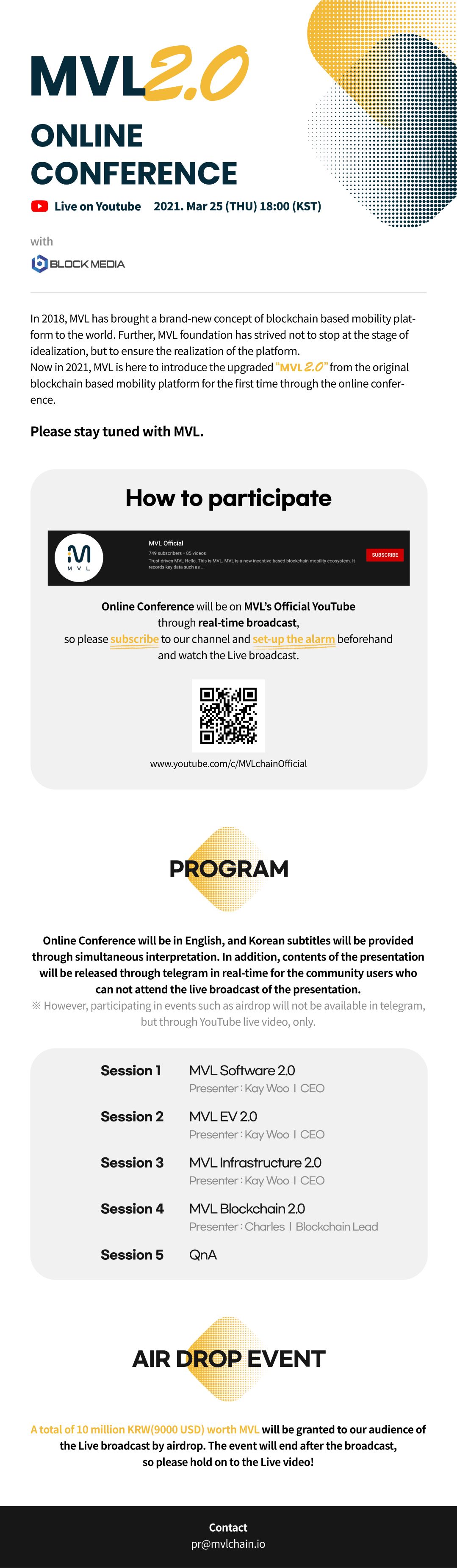 Besides, a total of 10 million KRW(9,000 USD) worth MVL will be granted to our audience of the Live broadcast through airdrop events.